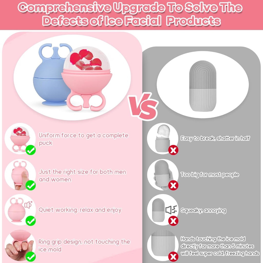 The 2 Pack Ice Roller for Face is a beauty tool designed for facial and body skincare. Each set includes two ice rollers in pink and blue, made from food-grade, BPA-free silicone that is reusable and durable. The rollers feature an ergonomic finger ring design to protect fingers from frostbite during extended use and a suction cup base to prevent tipping and water leakage in the freezer. To use, fill the mold with water, freeze for at least 5 hours, and then gently roll the ice in circular motions over the skin in 30-second intervals. This process helps tone skin, reduce puffiness, soothe irritation, promote blood circulation, and create a healthy glow. The compact and lightweight design makes it suitable for use on the face, neck, eyes, and body. Users can customize the rollers by adding ingredients like lemon water, green tea, cucumber water, mint leaves, or coconut juice for enhanced skincare benefits. Each roller measures approximately 4.72 x 3.94 x 1.97 inches.