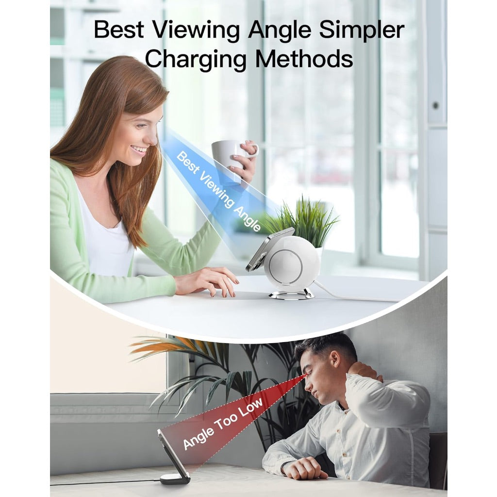 The 2025 3-in-1 Charging Station is a foldable wireless charging stand designed for Apple devices. It features a third-generation intelligent chip for fast charging and includes safety functions such as overcurrent protection, temperature detection, and foreign object detection. The station offers strong magnetic alignment for MagSafe-compatible iPhones, allowing the phone to be used in portrait or landscape orientation while charging. It is compatible with iPhone 17, 16, 15, 14, 13, and 12 series models that support MagSafe or are used with a MagSafe case. It also provides wireless charging for Apple Watch Series and AirPods Pro, Pro 2, and AirPods 4, 3, and 2 when equipped with a MagSafe charging case. The product has a minimalist, tech-forward design made from environmentally friendly materials, helping to organize charging cables on a desk or nightstand.