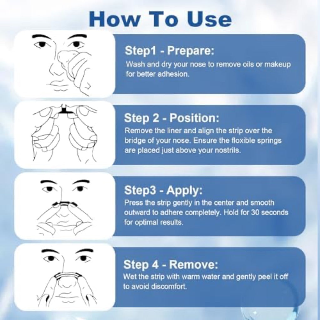 These nasal strips are designed to provide relief from nasal congestion and reduce snoring by gently lifting and opening nasal passages. The spring-like bands increase nasal airflow for easier breathing. Suitable for overnight use, they offer up to 12 hours of continuous relief. Made with a gentle adhesive, they are formulated for sensitive skin and are drug-free with no known side effects. The strips are easy to apply to clean, dry skin and stay securely in place during various activities, including sleep, exercise, yoga, running, and cycling. Each package contains 30 strips.
