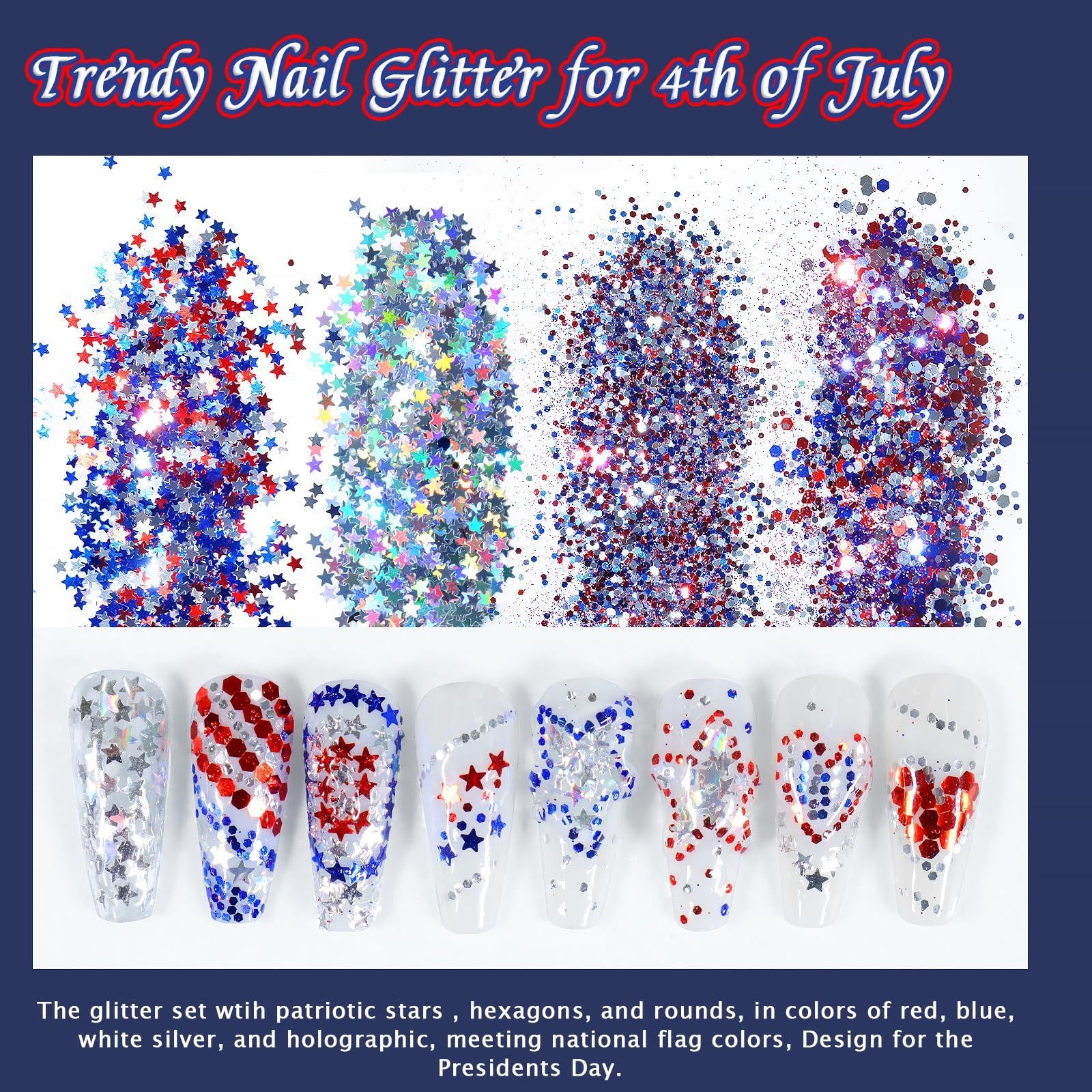 The Allstarry Nail Glitter set includes 4 jars of holographic, patriotic-themed chunky glitter flakes designed for nail art and body decoration. The collection features red, blue, and silver glitter in various shapes, including stars, hexagons, and rounds, inspired by the American flag. The glitter is made from high-quality, vegan, cruelty-free, non-toxic PET material that provides a long-lasting, sparkly finish. It is suitable for use with clear nail polish, builder gel, and top coats for manicures. Beyond nails, the glitter can be applied as body, face, or hair glitter for themed events. The product is intended for decorative use during patriotic holidays like Independence Day and Veterans Day, as well as for Olympic-themed parties and other celebrations.