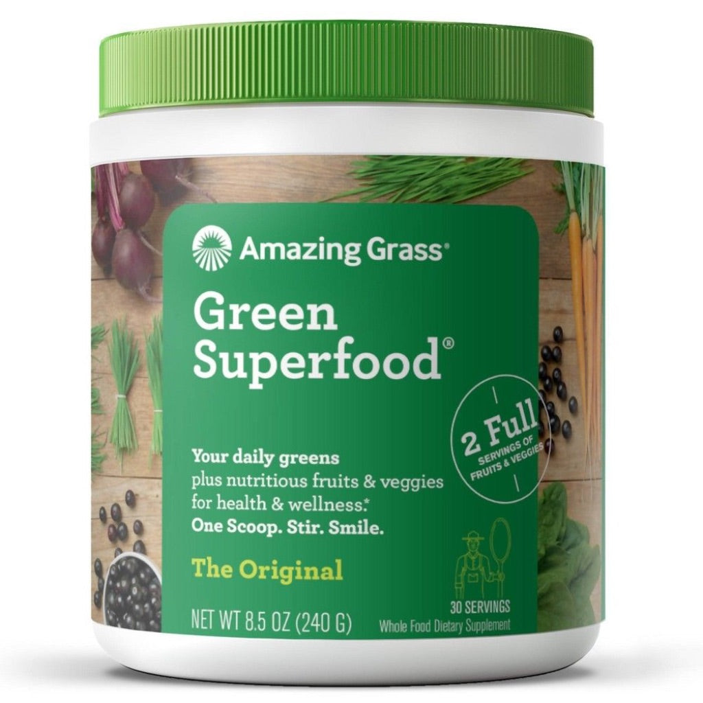 Amazing Grass Green Superfood Original is a nutrient-dense powdered supplement designed to support overall health and wellness. This 8.5-ounce container contains a comprehensive blend of organic greens including wheat grass, barley grass, alfalfa, spirulina, and chlorella. The formula is enriched with antioxidant-rich fruits and vegetables, providing essential vitamins, minerals, and digestive enzymes. This green superfood powder helps boost energy levels, support immune function, and promote digestive health. The product is typically mixed with water, juice, or added to smoothies for convenient daily consumption. With an expiration date of June 2027, this supplement offers a simple way to incorporate more plant-based nutrition into daily routines.