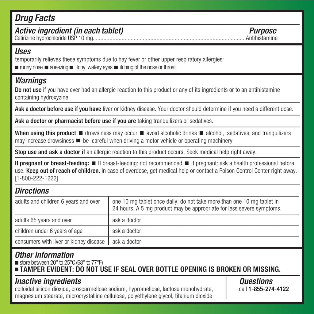 Amazon Basic Care 24 Hour Allergy Relief is an over-the-counter antihistamine medication. The active ingredient is Cetirizine Hydrochloride, 10 mg per tablet. This product is designed to provide temporary relief from common allergy symptoms for a full 24 hours with a single dose. It is effective for both indoor and outdoor allergies, helping to alleviate symptoms such as sneezing, runny nose, itchy nose or throat, and itchy, watery eyes. The tablets are gluten-free and are the original prescription strength. The product is available in a 300-count package.