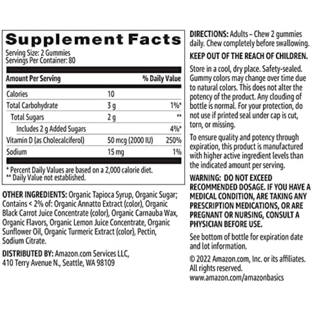 Amazon Basics Vitamin D3 2000 IU (50mcg) Gummies are a dietary supplement designed to support bone health, immune function, and overall wellness. Each serving provides 2000 International Units (IU) of Vitamin D3 (cholecalciferol), equivalent to 50 micrograms. The gummies feature a blend of natural orange, lemon, and strawberry flavors, making them a pleasant-tasting alternative to traditional pills or capsules. This product is formulated to be vegetarian and gluten-free. The bottle contains 160 gummies, providing an 80-day supply when taken at the recommended daily serving of two gummies. Vitamin D3 is a crucial nutrient that helps the body absorb calcium and phosphorus, contributing to the maintenance of normal bones and teeth, as well as supporting the normal function of the immune system.