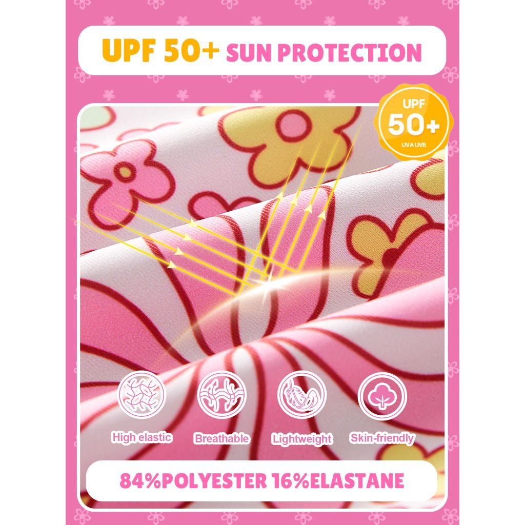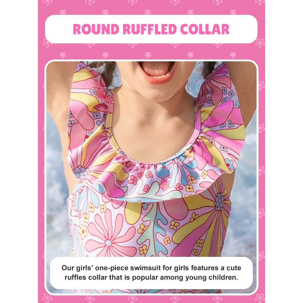 The Angel Season Girls' One Piece Swimsuit is a sun-protective swimwear designed for toddlers and young girls. This swimsuit features a vibrant pink daisy floral pattern and is constructed from a blend of 84% polyester and 16% elastane, with a 100% polyester lining. The fabric offers a soft feel, four-way stretch, and is resistant to chlorine and saltwater. It provides UPF 50+ sun protection, blocking 98% of harmful UV rays. The design includes a ruffled collar and a V-back detail for a cute aesthetic. It is available in size 2T and is suitable for activities such as beach outings, pool parties, and visits to water parks. The swimsuit is designed for easy wear and removal, dries quickly, and is intended for children's comfort and safety during water-based activities.