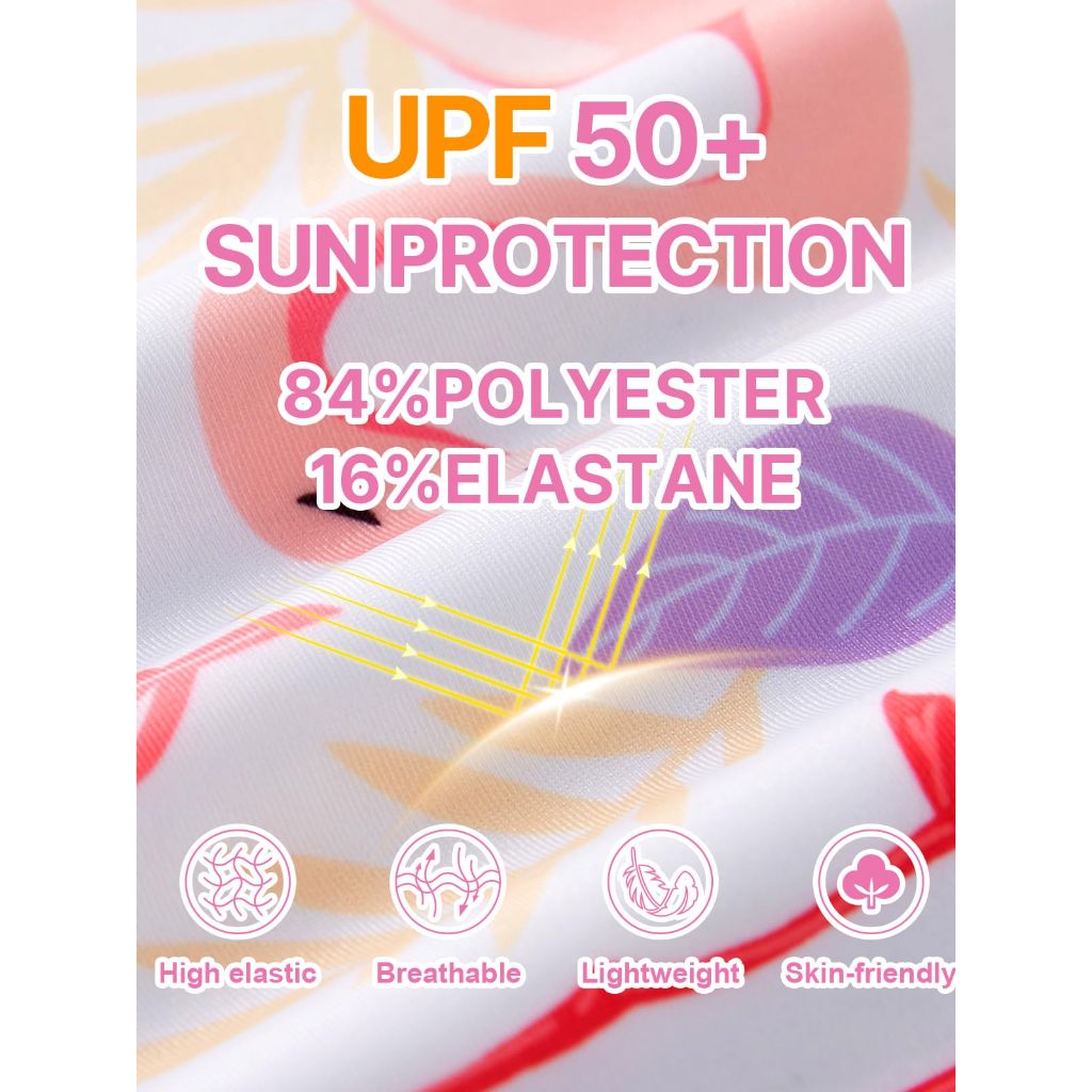The Angel Season Girls' Two-Piece Bikini Set is a swimsuit designed for toddlers and young girls. It features a tankini-style top with a crewneck design, combining a ruffled shoulder strap on one side and a halter strap on the other for a playful look. The bikini bottom is high-waisted for modest coverage and comfort. The set is constructed from a blend of 84% polyester and 16% elastane (spandex), providing a soft, lightweight, and quick-drying fabric with 4-way stretch. The material is treated to be chlorine and saltwater resistant with high color retention to prevent fading. It offers UPF 50+ sun protection. The swimsuit is available in a pink and purple flamingo print pattern. It comes in size 8, which is part of a size range typically covering children from 2T to 10T. The design is intended for activities such as swimming, beach outings, water parks, and pool parties.