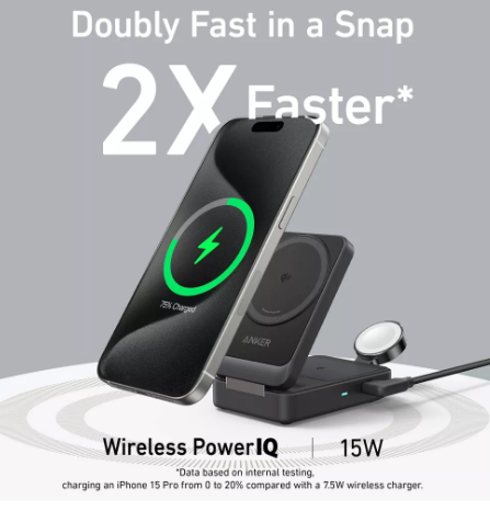 The Anker MagGo 3-in-1 iPhone 16 Charging Station is a MagSafe-compatible wireless charging stand designed to charge multiple Apple devices simultaneously. It features a foldable design for portability and is Qi2 certified, delivering up to 15W of fast wireless charging for compatible iPhones, including the iPhone 15 and 14 series. The station includes dedicated charging spots for an iPhone, Apple Watch (compatible with Series 9 and other models), and AirPods (or other Qi-enabled devices). It comes with a 40W USB-C power adapter to power all three charging coils. The compact, black stand offers a space-saving solution for desks or nightstands, keeping devices organized while charging.