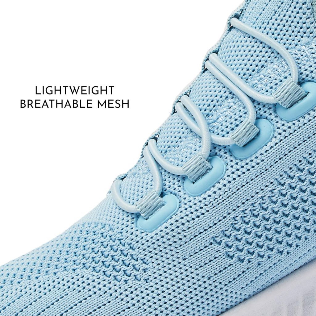 The Avia Air Slip-On Shoes for Women are athletic footwear designed for comfort and convenience. These shoes feature a slip-on design with Gore laces that require no tying, making them easy to put on and take off. The upper is constructed from a breathable engineered knit mesh that provides ventilation and a sock-like fit. A removable memory foam insole conforms to the shape of the foot to reduce pressure points and offer personalized comfort. The midsole is made from compression molded EVA, and the shoe includes an anatomical heel cradle and a soft padded collar for shock absorption, cushioning, and support. Available in Aqua Blue, this model is suitable for various athletic activities such as walking, jogging, gym workouts, cycling, and travel. The shoes are offered in women's sizes 6 to 12, in both Medium (B) and Wide (D) widths.
