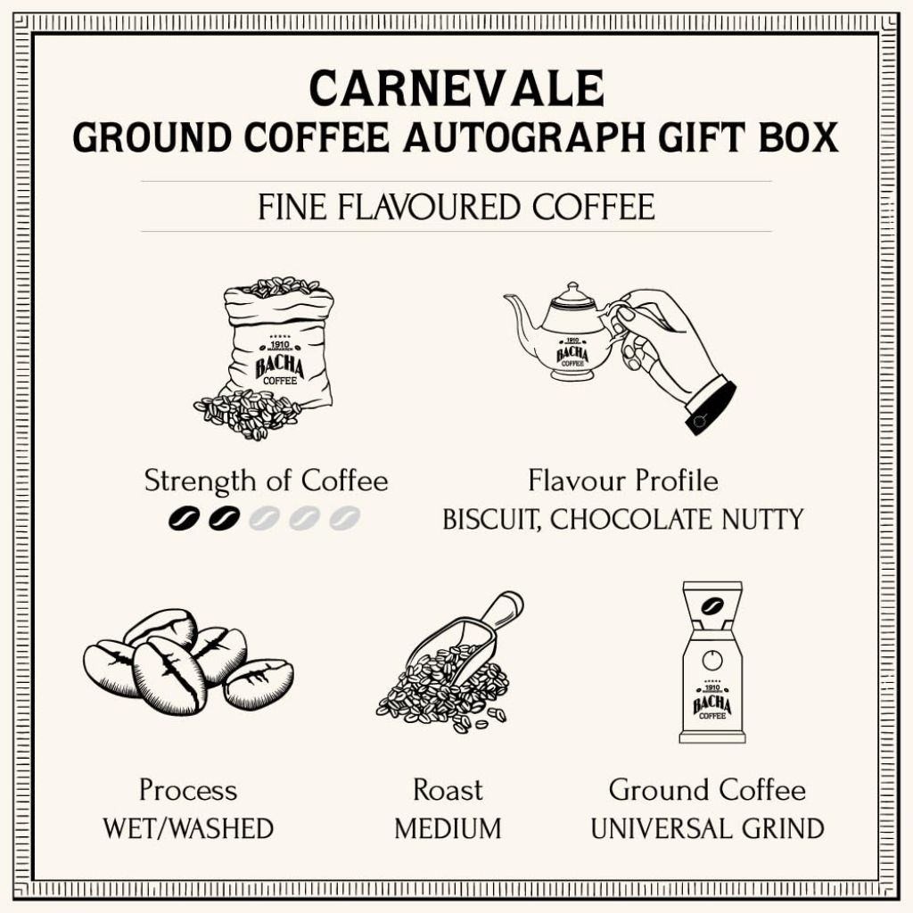 Bacha Coffee Carnevale is a fine flavored ground coffee from the Autograph Collection. This medium roast specialty coffee is made from 100% Arabica beans selected for superior flavor and quality. The coffee features tasting notes of hazelnut, warm chocolate, and a hint of orange zest, creating a celebratory flavor profile. The product comes in a 350g tin-plated steel canister with a traditional clasp closure that helps protect the coffee from air, light, and humidity. The cheerfully colored canister features stylish design inspired by traditional coffee making art and is reusable after cleaning with warm, soapy water and thorough drying. The coffee is ground to perfection for convenient brewing. This item is guaranteed to be fresh for at least 60 days from: 11/28/2025