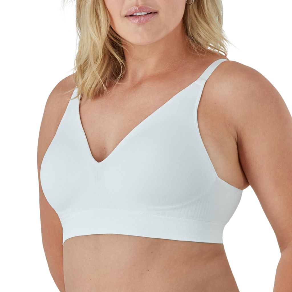 The Bali Comfort Revolution Modern Seamless Wireless Bra is a full-coverage, wireless undergarment designed for everyday comfort and support. It is crafted from Bali's proprietary ComfortFlex Fit fabric, a silky, four-way stretch material that flexes and moves with the body. The bra features seamless, thin foam cups that provide shaping and modesty while remaining smooth under clothing. A wide bottom band offers gentle underbust support without the need for underwires. Built-up sides and a smoothing back panel are designed to minimize bulges for a sleek silhouette. The fabric incorporates Cool Comfort technology, which is moisture-wicking to help keep the wearer cool and dry. The design includes a flattering V-neckline and fully adjustable, convertible straps that can be worn traditionally or in a crisscross style for versatility. This bra is intended as a foundational, comfortable option suitable for wear under various types of clothing, including t-shirts, blouses, and dresses.