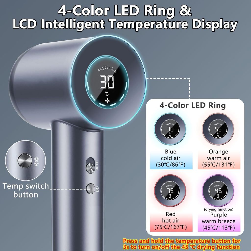 The Baoanny Hair Dryer is a professional-grade negative ionic blow dryer designed for efficient and safe hair drying. It features intelligent temperature control with an NTC temperature detector and microprocessor that monitors air outlet temperature 100 times per second to prevent heat damage. The dryer emits 200 million negative ions to lock in moisture, reduce frizz, prevent static electricity, and add natural shine to hair. Powered by a high-speed brushless motor operating at 110,000 RPM, it generates a wind speed of 22m/s for drying that is up to three times faster than traditional hair dryers. The device includes four heat settings (30°C, 45°C, 55°C, and 75°C) and two speed settings (Medium and Fast), with a color-coded LED ring light and HD LCD display that indicates the selected temperature mode. It has a lightweight design weighing approximately 2 pounds (950 grams) and operates at a noise level of 59dB. The hair dryer comes with a magnetic concentrator nozzle for targeted airflow and a fine filter mesh to prevent hair from being sucked in. Its ergonomic design makes it suitable for both home use and travel.