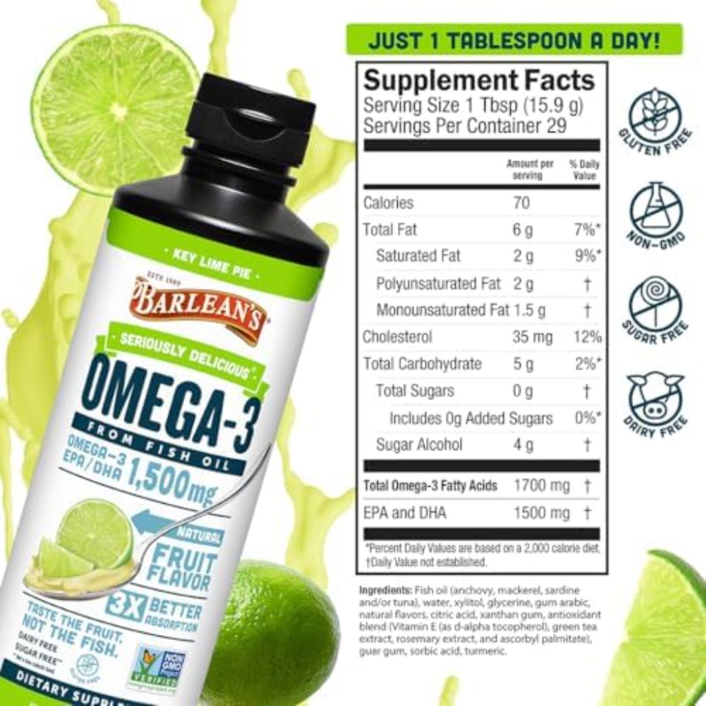 Barlean's Omega 3 Fish Oil Liquid Supplement is a dietary supplement designed to provide essential fatty acids. It features a Key Lime Pie flavor and a creamy, smoothie-like texture intended to be palatable for both adults and children. Each serving contains 1500mg of combined EPA and DHA omega-3 fatty acids, which are nutrients that support overall health. The product is formulated using a proprietary emulsification process that aims to enhance absorption and reduce the likelihood of fish burps or aftertaste. It is made from wild-caught, purified fish oil that is tested to be free from mercury and other heavy metals. This supplement is dairy-free, sugar-free, non-GMO, and contains no artificial flavors, colors, or sweeteners. The suggested use is one tablespoon daily for individuals ages 4 and up. It can be consumed directly, added to yogurt, oatmeal, or blended into smoothies. The product requires refrigeration after opening. Barlean's is the brand responsible for this supplement, which is manufactured in the USA.