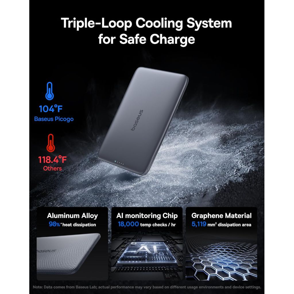 The Baseus Picogo Power Bank is an ultra-slim, magnetic portable charger designed for MagSafe-compatible iPhones. It features a 5000mAh battery capacity, providing a reliable secondary power source for on-the-go charging. The device has an exceptionally thin profile of 0.3 inches and a lightweight design of 3.8 ounces, making it highly portable. It utilizes strong magnets with an 11N force for secure attachment to the back of an iPhone, allowing for simultaneous charging and use. The power bank includes a 20W USB-C port for fast wired charging, capable of charging an iPhone from 0% to 55% in approximately 30 minutes. It is constructed with a durable aluminum shell for heat dissipation and scratch resistance, and features a nano-coated silicone surface that is waterproof and fingerprint-resistant. The design incorporates a 5D curved edge for ergonomic comfort and a precise fit that aligns with the iPhone's dimensions without protruding. The internal battery technology incorporates advanced materials like graphene and features an NTC temperature control chip to manage heat, keeping operating temperatures below 104°F. It is certified by various international standards including FCC, UL, TÜV, DOE, CEC, UN, IEC, and RoHS. Baseus is the manufacturer, a company known for holding numerous global patents and design awards.