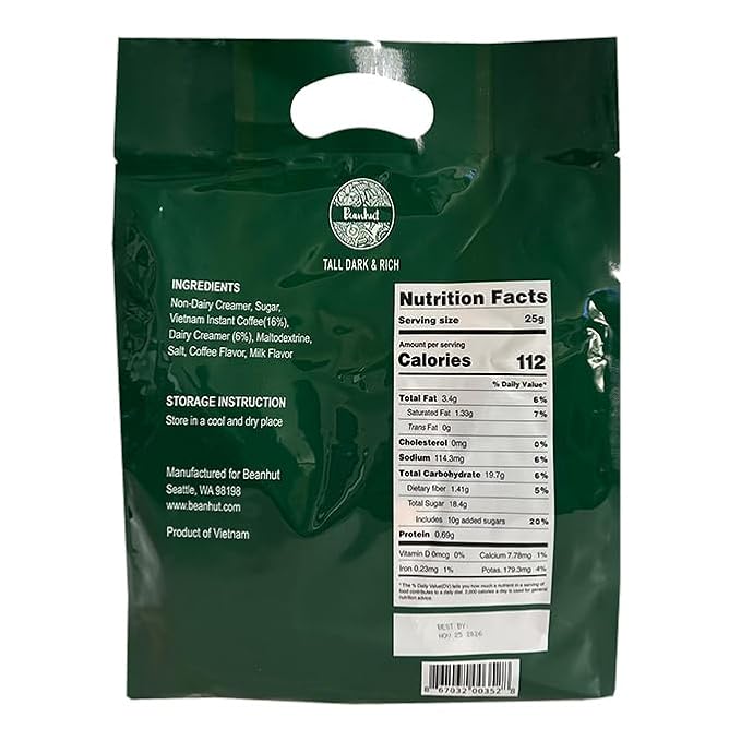 Beanhut's Vietnamese Latte is a 3-in-1 instant coffee mix designed to deliver the authentic taste of traditional Vietnamese coffee. Each packet contains a pre-blended combination of coffee, creamer, and sugar for convenient preparation. The mix produces a strong, rich, and bold coffee with a smooth, velvety texture and deep aroma. Each single-serve packet contains 25 grams of product. The coffee can be prepared simply by adding hot water and can also be enjoyed as an iced beverage. This product is packaged in a box containing 50 individual packets, with a total net weight of 2.75 pounds (44 ounces). The product dimensions are approximately 10 x 4 x 13.55 inches.