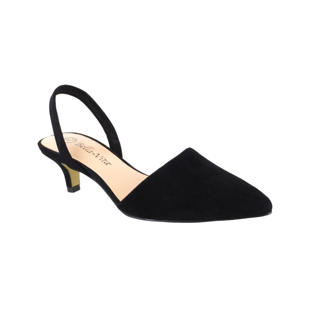 The Bella Vita Sarah Slingback Pumps are elegant women's dress shoes designed to complement a sophisticated wardrobe. These pumps feature a sleek, narrow toe shape that creates a refined and feminine look. The shoe is constructed with a comfortable kitten heel, providing a subtle lift while maintaining ease of wear and stability. The upper is made from soft black suede, offering a luxurious texture and appearance. A key feature is the elasticized slingback strap at the heel, which ensures a secure and adjustable fit by holding the foot comfortably in place. This design makes the shoe practical for extended wear. The overall silhouette is ladylike and streamlined, suitable for various formal occasions, professional settings, or special events where a polished look is desired.