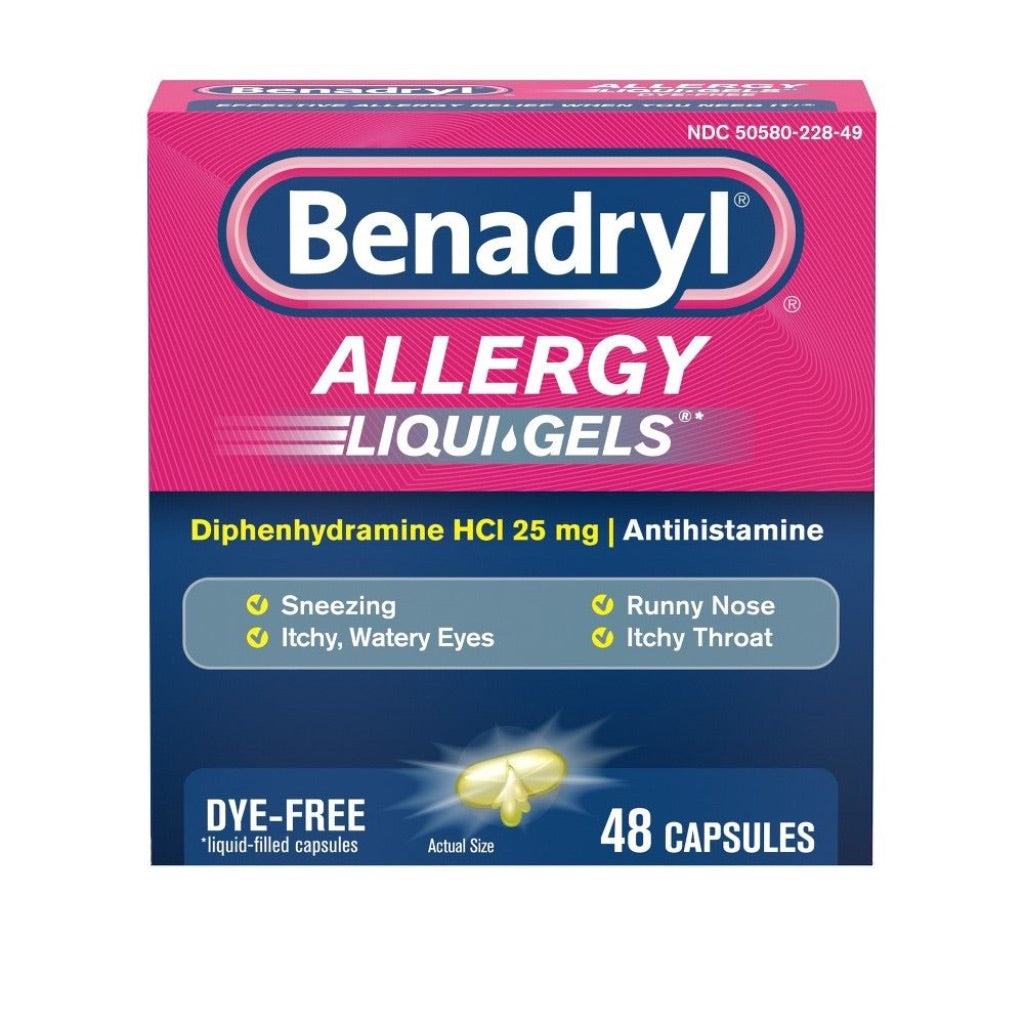 Benadryl Dye-Free Liqui-Gels Antihistamine Allergy Medicine provides temporary relief from allergy and cold symptoms. Each liquid gel capsule contains 25 mg of the antihistamine diphenhydramine HCl. This medication is designed to treat symptoms associated with hay fever and other upper respiratory allergies, including those caused by common allergens such as pollen, dust mites, mold, and pet dander. It effectively relieves sneezing, runny nose, itchy nose or throat, and itchy, watery eyes. The formula is free of dyes and is intended for use by adults and children ages six and up. The product comes in a package containing 48 capsules.