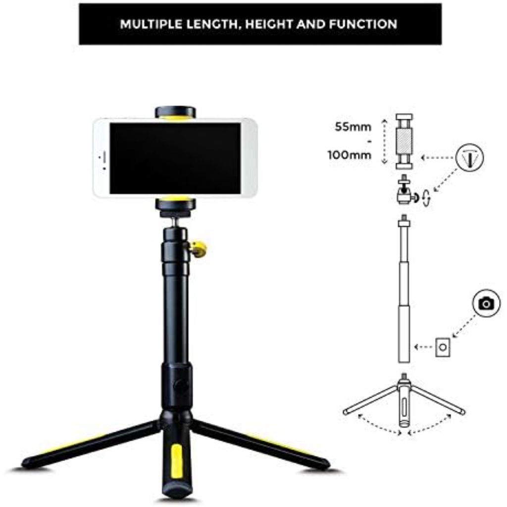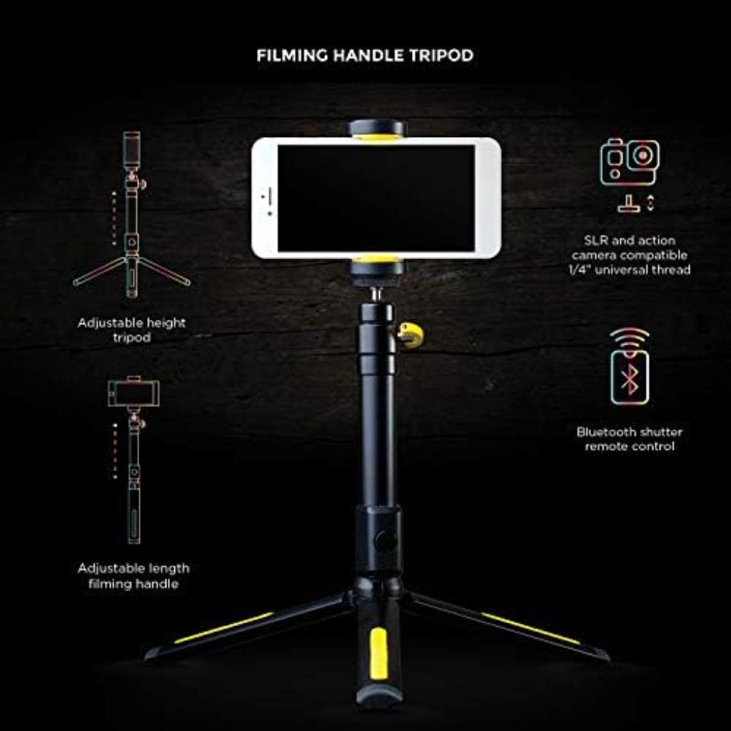 The Black Eye FM001 is a versatile filming handle and tripod system designed for content creators. It features a sturdy, adjustable tripod with a strong clamp attachment system that securely holds iPhones, Android smartphones, and other smart devices. The system also supports SLR and action cameras via a standard ¼-inch screw attachment. A key component is the detachable Bluetooth shutter remote control, compatible with both iPhone and Android devices, allowing for hands-free operation. The adjustable height provides flexibility for various shooting angles and perspectives. The product is typically packaged with a universal smartphone mount, a travel bag for portability, an Allen key for assembly adjustments, and a battery for the remote.