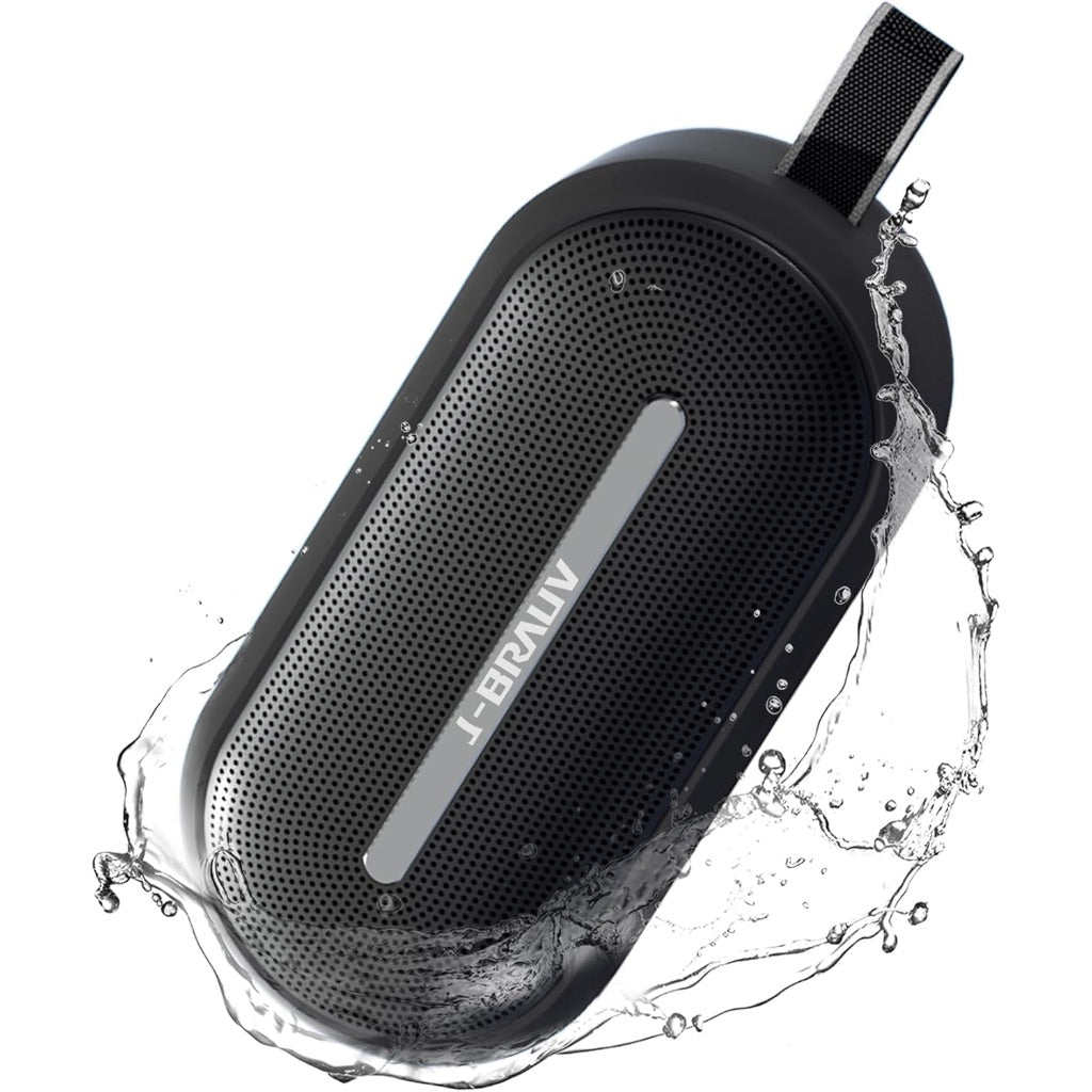 The J-BRAUV Flex is a portable Bluetooth speaker featuring 25W stereo sound output with dual drivers and passive radiators for enhanced bass response. This wireless speaker utilizes Bluetooth 5.3 technology for stable connectivity and features True Wireless Stereo (TWS) pairing capability, allowing two speakers to be connected for immersive stereo sound. The speaker is IP67 rated for waterproof and dustproof performance, making it suitable for outdoor use in various environments including pools, beaches, and hiking. It includes a built-in 2500mAh rechargeable lithium battery providing up to 14 hours of playtime and supports USB-C charging. Additional features include a built-in microphone for hands-free calling, touch controls, and compatibility with smartphones, tablets, and MP3 players. The speaker measures 7 inches in depth, 3 inches in width, and 3 inches in height, with a weight of 1.36 pounds. Constructed from Thermoplastic Polyurethane (TPU), it offers durable and portable design for indoor and outdoor use.