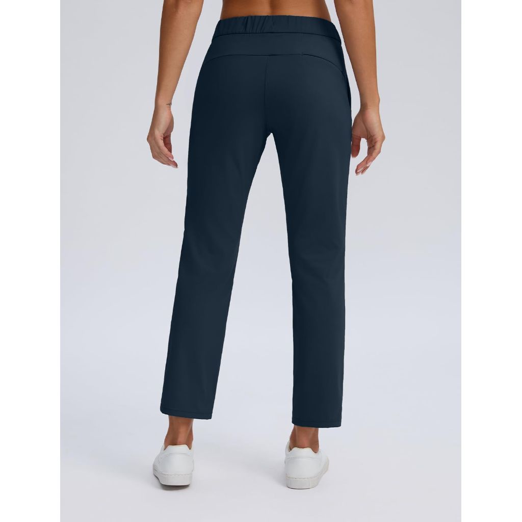 The Bobobigo Women's Golf Pants are designed for active women seeking comfort and style on and off the golf course. Crafted from a soft, 4-way stretch knit fabric, these pants offer exceptional flexibility and all-day comfort. The tapered 7/8 length provides a modern, polished silhouette that moves with you. An adjustable drawstring waistband ensures a secure, no-fuss fit. Functionality is enhanced with four pockets: two deep side pockets, a zippered back pocket, and a hidden pocket for securing valuables. Available in Navy, these versatile pants are suitable for golf, travel, casual wear, work, athletic activities, lounging, and workouts.