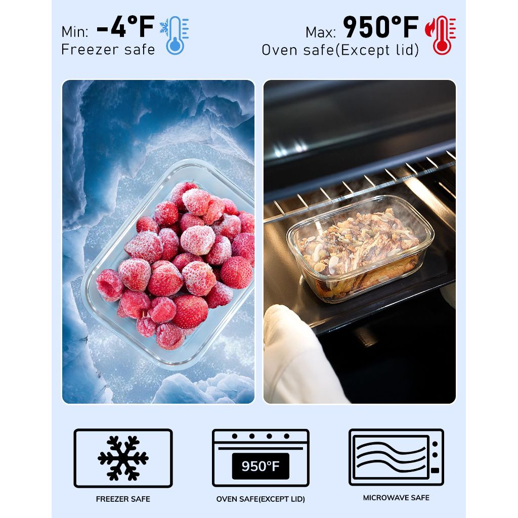 The BOROHOUSE 5-Pack Glass Containers are a set of food storage containers designed for meal preparation and storage. Each container is made from borosilicate glass, a material known for its durability and resistance to thermal shock, allowing it to safely withstand temperatures ranging from -4°F to 950°F. This makes the containers suitable for use in the freezer, microwave, oven, and for baking. The set includes five containers, each with a capacity of 35.2 ounces or approximately 4.4 cups. Each container is paired with a tempered glass lid that features a snap-on closure. The lids are designed to be airtight, helping to preserve food freshness and prevent odor transfer. An easy-open air vent is incorporated into the lid design to facilitate opening. Both the glass containers and the tempered glass lids are dishwasher safe, with a recommended drying temperature for the lids below 176°F. The containers feature a stackable design for efficient storage in refrigerators, freezers, or pantries. The product is packaged in a gift-ready box.