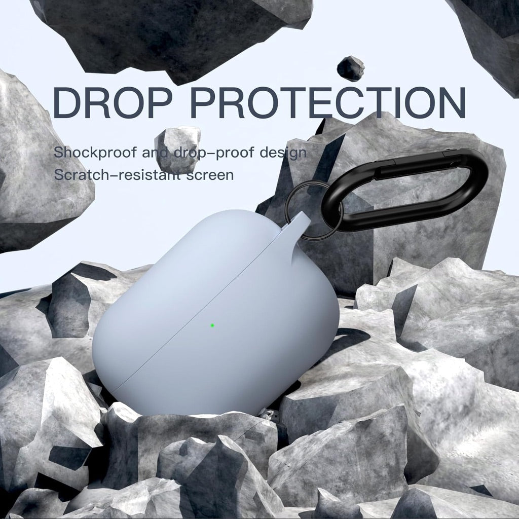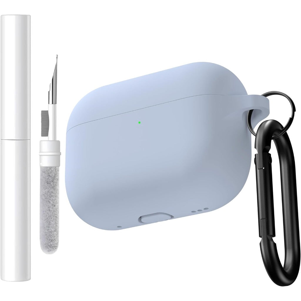 The Brujula Case is a silicone protective cover designed specifically for the AirPods Pro 3rd Generation (2025) charging case. It is constructed from premium silicone material that provides anti-drop, anti-scratch, and anti-fingerprint protection while keeping the case dust-free. The case features a one-piece design that prevents the lid from accidentally coming off and includes a dust plug at the bottom to seal and protect the charging port when not in use. With a 2mm thickness, it supports both wired and wireless charging without needing to be removed, and the LED light remains visible during charging. The product includes an anti-lost keychain and a hand strap for secure and convenient portability. The package contains one silicone protective case, one anti-lost keychain, and one cleaning pen. The case is available in Light Blue and is not compatible with other AirPods models, including AirPods 2, 3, 4, AirPods Pro (2019), or AirPods Pro 2 (2022).