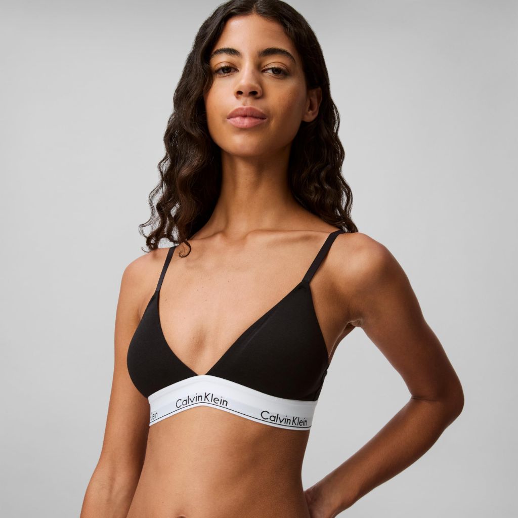 The Calvin Klein Modern Cotton Lightly Lined Triangle Bralette is a signature piece from the Calvin Klein brand, designed for everyday comfort and a sporty yet sexy aesthetic. It features a triangle cup design that is lightly lined for subtle shaping and support, without underwire or padding for a natural feel. The bralette is constructed from a premium cotton stretch blend that incorporates modal, resulting in a fabric that is super soft, supple, breathable, and retains its shape. It includes the iconic Calvin Klein logo band and an ultra-soft, flexible band with a hook-and-eye closure at the back. The slim, adjustable straps are convertible to a racerback style, making it suitable for both daily wear and workouts. This bralette is designed to be part of a matching set with Calvin Klein's Modern Cotton bikini panties and is machine washable for easy care. The product is designed in the USA by Calvin Klein's global design team using imported materials.