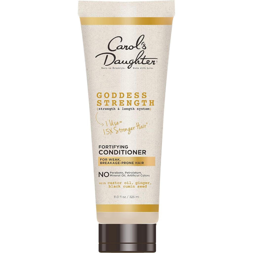 Carol's Daughter Goddess Strength Fortifying Conditioner is a sulfate-free hair care product specifically formulated for wavy, coily, and curly hair types that are weak or prone to breakage. Its fortifying formula is enriched with Castor Oil, Black Cumin Seed Oil, and Ginger to help strengthen hair from root to tip. The conditioner works to restore intense moisture, making hair easier to detangle and reducing breakage to help maintain length. When used as part of the complete Goddess Strength system (shampoo, conditioner, oil, and leave-in cream), it is designed to deliver hair that is 15 times stronger with 94% less breakage after a single use. It can be applied as a standard rinse-out conditioner or left on for 5-7 minutes as a deep conditioning treatment. The product comes in an 11-fluid ounce bottle. Carol's Daughter is a Black woman-founded brand, established by Lisa Price in 1993 with a focus on creating products for natural hair.
