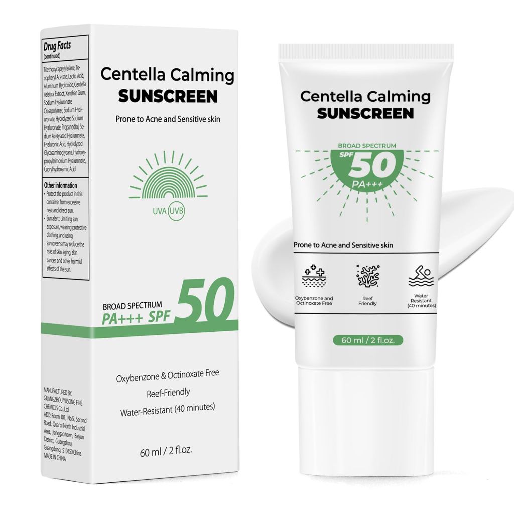 The Centella Sunscreen SPF 50 is a broad-spectrum facial sunscreen serum designed for daily protection and skincare. It offers SPF 50+ PA+++ protection against UVA and UVB rays using a combination of physical (micronized Zinc Oxide and Titanium Dioxide) and chemical filters. The formula is infused with Centella Asiatica extract to soothe and calm sensitive, sun-exposed skin, and contains Niacinamide to help brighten the complexion. It includes 6 types of Hyaluronic Acid to provide deep hydration and reinforce the skin's moisture barrier. The lightweight, water-fit serum texture absorbs quickly without leaving a white cast, stickiness, or greasy residue, making it suitable as a makeup base. This sunscreen is formulated to be fragrance-free and is free from parabens, oxybenzone, and ethylhexyl methoxycinnamate. It is suitable for all skin types, including sensitive and acne-prone skin. The product comes in a 2 fl.oz (approximately 59 ml) travel-friendly size.