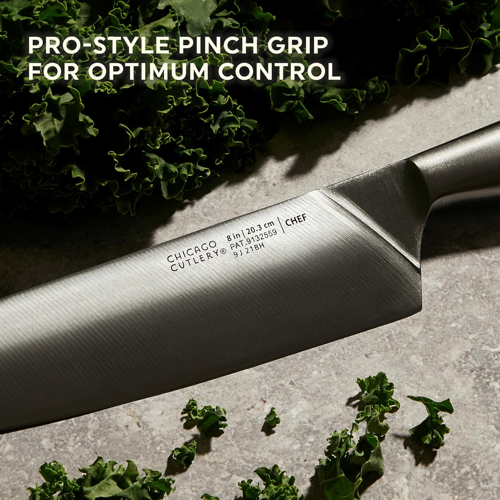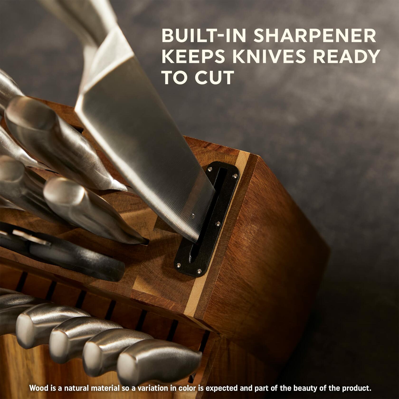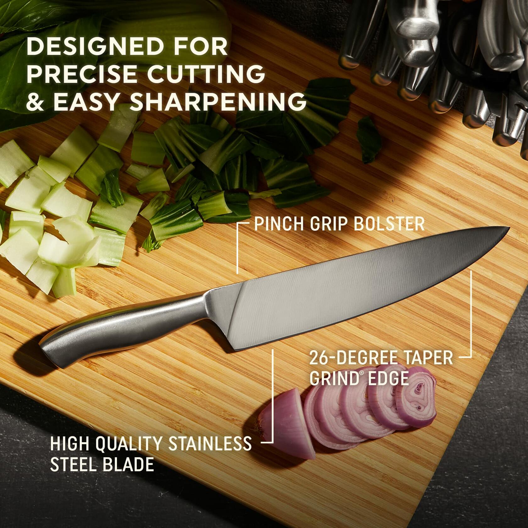 The Chicago Cutlery Insignia 18-Piece Knife Block Set is a comprehensive kitchen cutlery collection featuring high-carbon stainless steel blades that resist stains and corrosion. This set includes 17 specialized knives and 1 pair of kitchen shears, all housed in an acacia wood block with a built-in sharpener for convenient maintenance. The blades feature a 26-degree taper grind edge for optimal sharpness and precision cutting performance. Included knives are: 8-inch chef knife, 8-inch slicing knife, 7-inch serrated bread knife, 7-inch santoku knife, 5-inch boning knife, 5.5-inch utility knife, 3.5-inch paring knife, 3-inch peeler knife, and eight 4.5-inch steak knives. Each knife features ergonomically designed handles with a curved, slip-resistant grip for comfortable use and enhanced control during food preparation tasks. The integrated sharpener in the knife block ensures blades maintain their cutting edge over time. This set is designed to handle various kitchen tasks including slicing, dicing, chopping, boning, and bread cutting.