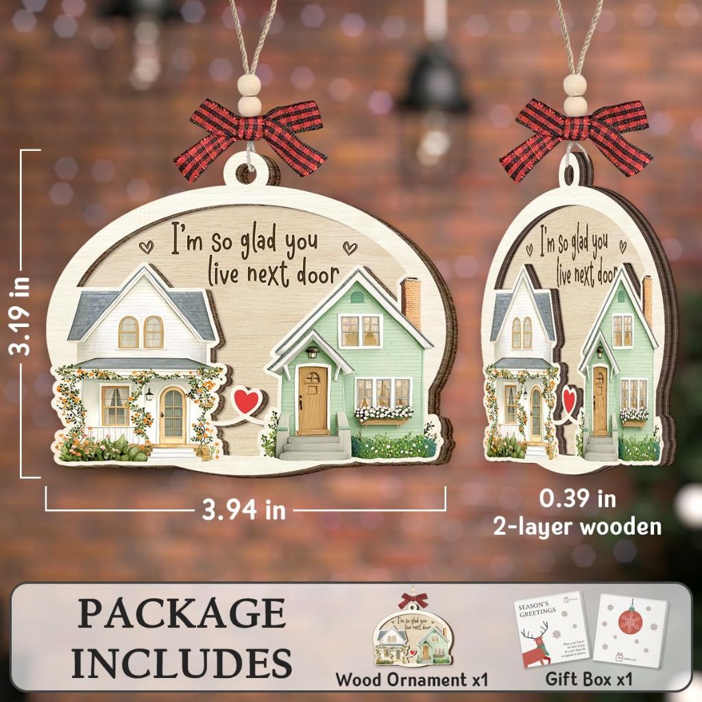 The Christmas Ornament "I'm So Glad You Live Next Door" is a decorative wooden ornament designed to celebrate neighborly friendship and community spirit. It features a charming house design with warm home details and a heartfelt message. The ornament is crafted from sturdy wood and measures approximately 3.2 inches wide by 3.9 inches high by 0.4 inches thick. It includes a hanging loop with a decorative bow for easy display on Christmas trees, wreaths, or other holiday decor. The ornament is suitable for farmhouse, cozy home, or general Christmas party decorations. It is presented in an adorable gifting box, making it ready for presentation as a gift for neighbors, friends, or as a housewarming present.