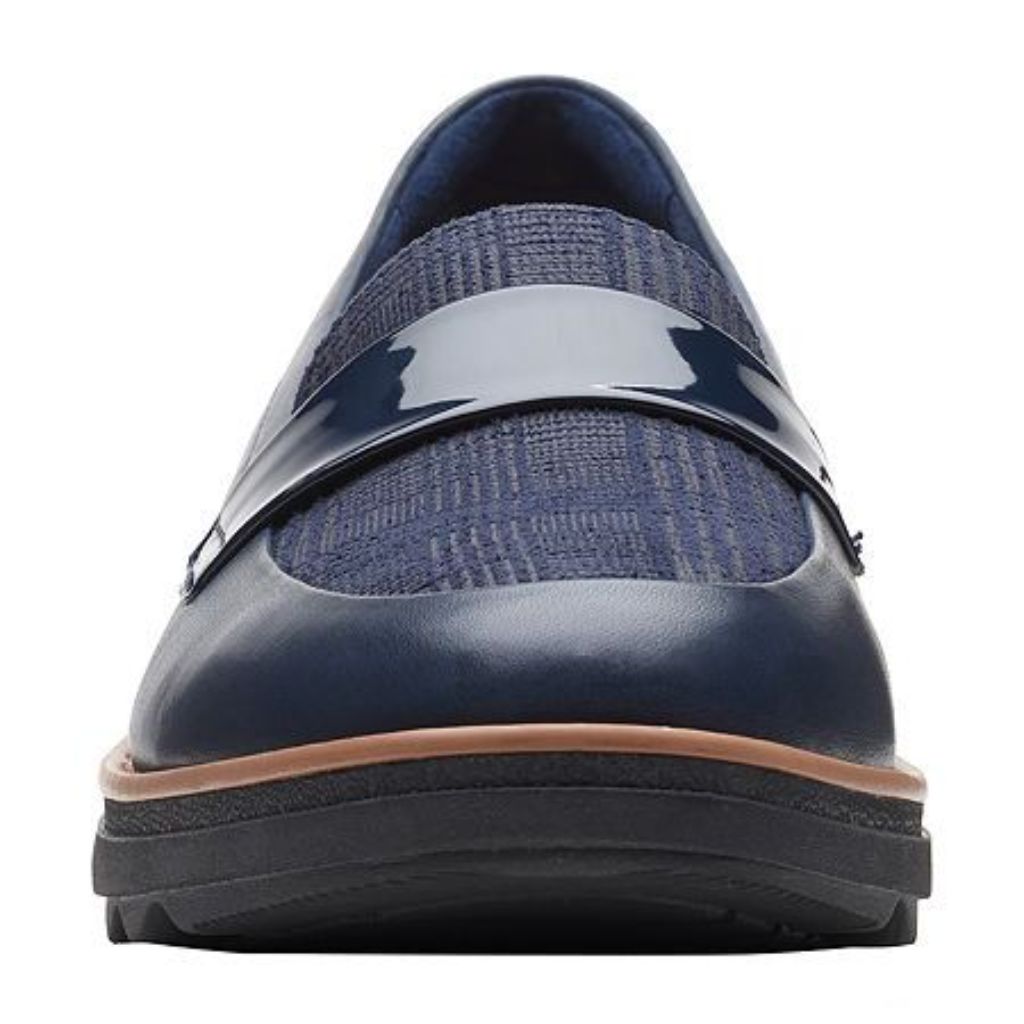 The Clarks Women's Sharon Gracie Loafer is a classic slip-on shoe designed for comfort and style. Crafted from premium black leather, this loafer features a 1.8-inch wedge heel that provides both elevation and stability. The shoe incorporates Clarks' Cushion Soft technology for exceptional shock absorption and walking comfort. The OrthoLite Hybrid footbed offers targeted, dual-density support with breathable comfort, utilizing 20% recycled rubber and foam materials. The cleated sole design ensures reliable traction on various surfaces. Available in wide width sizing, this loafer combines timeless elegance with modern comfort features, making it suitable for both casual and professional settings. The slip-on design offers convenient wearability while maintaining a sophisticated appearance. FEATURES