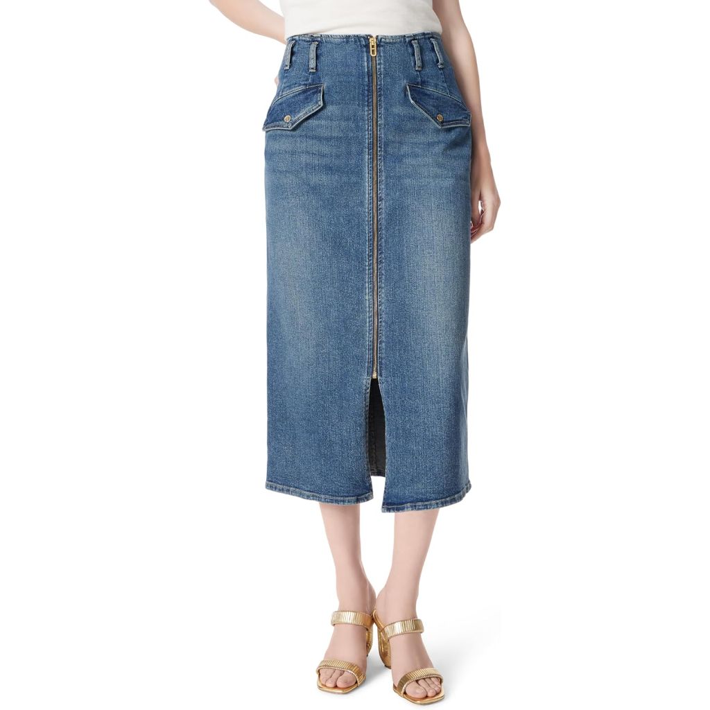 The DEE OCLEPPO Women's Millie Zipper Front Denim Skirt is a below-the-knee pencil skirt designed for a chic and versatile look. It features a distinctive full-length zipper closure on the front, two functional flap pockets, and a center slit for added style and movement. Constructed from denim fabric, the skirt is offered in an Ocean Blue color. The design combines classic tailoring with modern details, making it suitable for pairing with a variety of tops, including blouses, sweaters, and t-shirts. The skirt measures approximately 31.5 inches from the waist to the hemline. It is part of the DO by Dee Ocleppo collection, which focuses on craftsmanship and designs intended to inspire confidence.