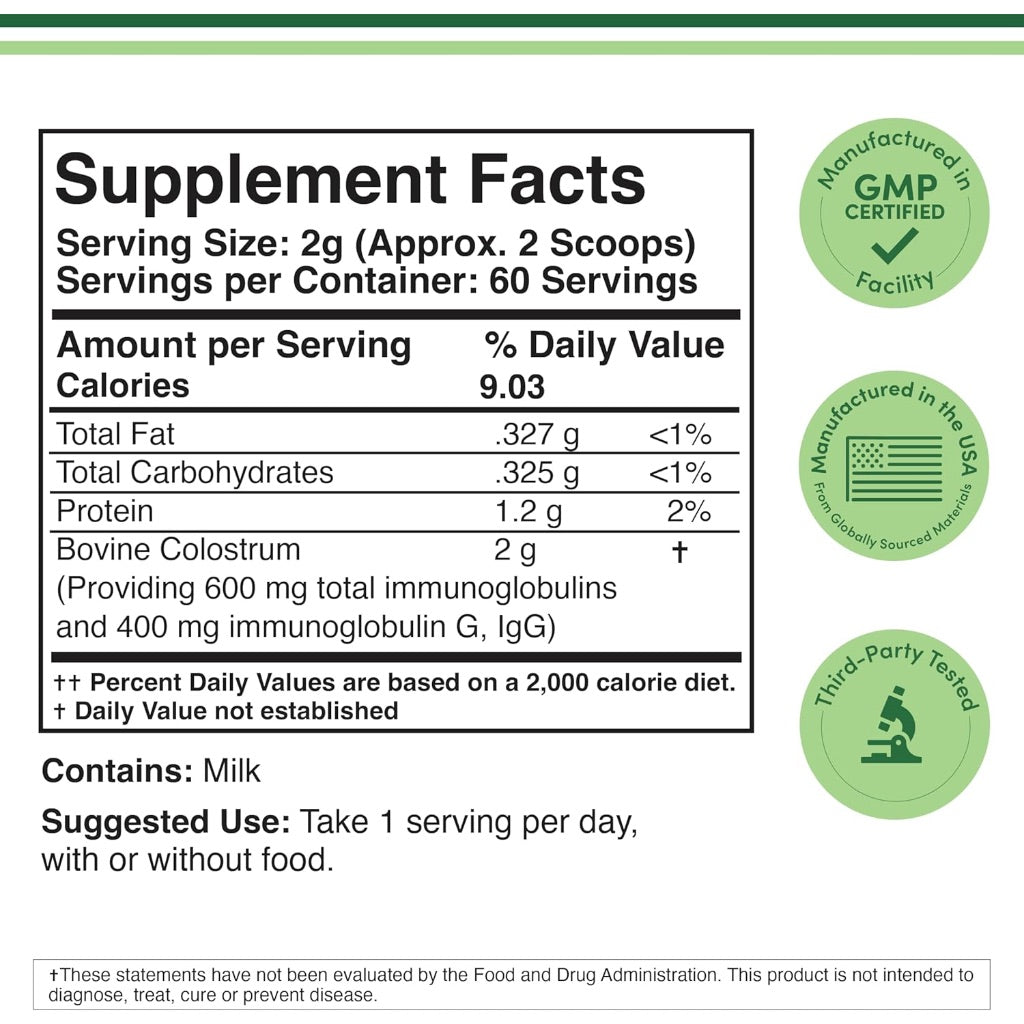 Double Wood Supplements Bovine Colostrum Powder is a dietary supplement derived from bovine colostrum, standardized to contain 30% total immunoglobulins and 60% protein. This 120-gram powder provides a 60-day supply and is designed to support gut health by promoting a healthy intestinal lining and aiding in digestive function. The supplement also contributes to immune system support through its high immunoglobulin content, which helps defend against pathogens. Additionally, it contains growth factors and nutrients that may benefit skin and hair health. The product is suitable for both women and men and is typically consumed by mixing the powder with water, juice, or smoothies.