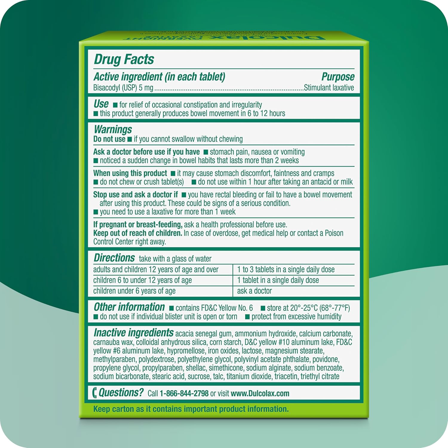 Dulcolax Stimulant Laxative Tablets provide overnight relief from occasional constipation. The active ingredient, bisacodyl, is a stimulant laxative that works by increasing intestinal movement to help produce a bowel movement. The tablets are comfort-coated to help prevent stomach upset. Each dose is designed to provide relief within 6 to 12 hours, making it suitable for use at bedtime to help wake up to relief. This product helps alleviate symptoms associated with constipation, such as bloating, straining, and hard stools. The package contains 50 tablets.