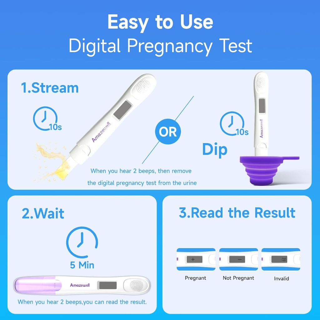 The Amazewell Early Detection Pregnancy Test Kit is a comprehensive home testing solution that includes 8 early pregnancy test strips, 2 digital pregnancy tests, and 1 urine collection cup. This kit is designed to provide early indications of pregnancy, with the ability to detect results up to 6 days before a missed period. The early pregnancy test strips feature a wider 0.47-inch design that enhances urine absorption for faster results. These strips display results with two lines indicating a positive pregnancy test. The digital pregnancy tests provide clear results with a '+' symbol for positive results and include unique sound alerts that beep twice during sample collection and twice when results are ready after 5 minutes. The tests work by detecting the presence of human chorionic gonadotropin (HCG) hormone in urine, with sensitivity to even low levels of HCG. The kit is over 99% accurate when used according to instructions and provides clear, easy-to-read results for home pregnancy testing.