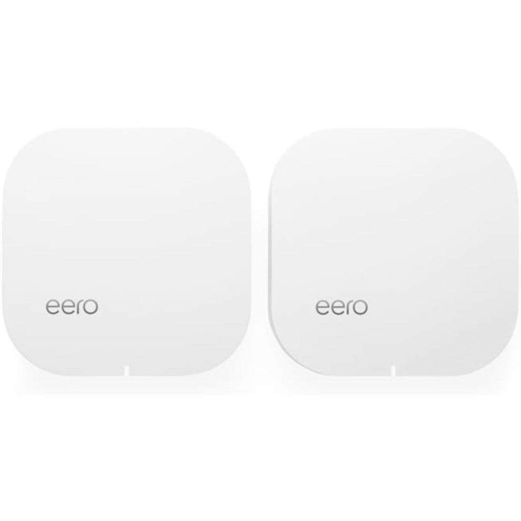 The eero Home WiFi System (Pack of 2) - 1st generation, released in 2016, is a mesh WiFi system designed to eliminate dead zones and provide reliable whole-home coverage. Each eero unit functions as a WiFi access point, and the system automatically optimizes network performance by selecting the best path for data to travel between devices. The system is capable of covering homes up to 3,000 square feet and supports speeds up to 350 Mbps. It features dual-band WiFi (2.4 GHz and 5 GHz), two Gigabit Ethernet ports per unit for wired connections, and a simple setup process managed through a companion smartphone app. The system is designed to be aesthetically unobtrusive, with a compact, white, square-shaped design.