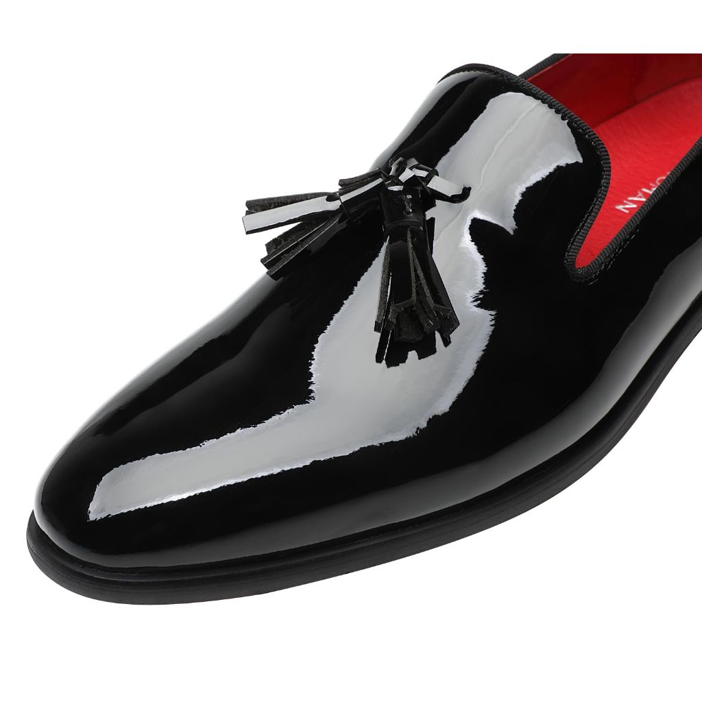 The ELANROMAN Men's Tassel Loafers are sophisticated dress shoes designed for formal occasions. They feature a smooth, high-gloss black patent leather upper that provides a luxurious and refined appearance, enhanced by decorative tassel detailing. These loafers are equipped with a brand-customized removable insole offering arch support, shock absorption, cushioning, and anti-slip properties. The durable outsole is made from a specialized red rubber compound developed by ELANROMAN for enhanced flexibility, abrasion resistance, and anti-friction performance, rated for over 80,000 uses. The versatile style is suitable for pairing with tuxedos, suits, and other formal attire for events such as weddings, business functions, and evening gatherings. The product arrives in ELANROMAN's professional luxury gift packaging, which includes a branded shoebox, shoe covers, tissue paper, and a shoehorn.