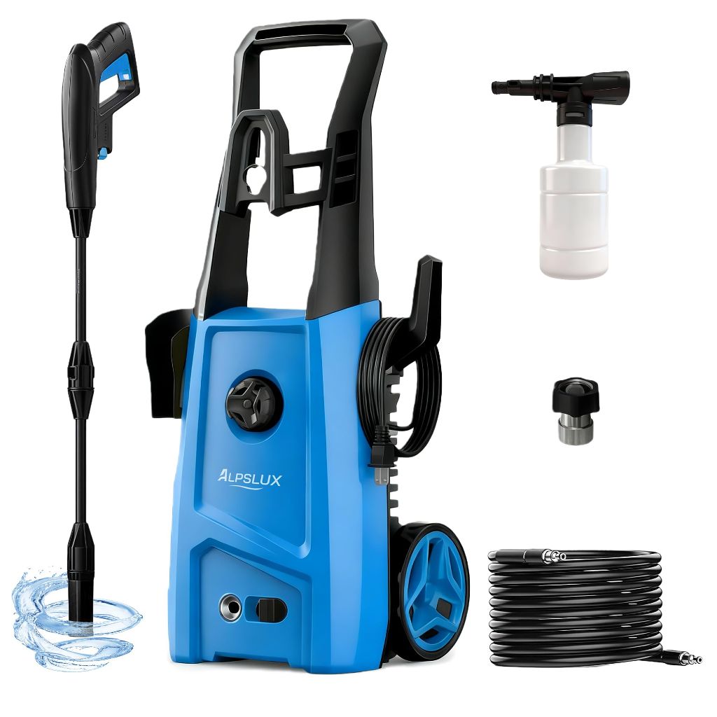 | This electric pressure washer is a versatile cleaning machine designed for a wide range of household and outdoor applications. It features a powerful high-pressure water flow capable of removing stubborn dirt, mud, and grime from various surfaces. The unit includes an adjustable nozzle that allows users to switch between different spray patterns and pressure levels without needing to change nozzles. A foam cannon attachment is included, which generates thick, clinging foam for enhanced cleaning on vehicles, fences, patios, and other surfaces. The washer incorporates a detergent bypass design to protect the pump and ensure longer-lasting performance. It offers dual water intake options, allowing it to draw water from either a standard faucet or a bucket for maximum flexibility. For ease of mobility, the machine is equipped with smooth-rolling wheels and a sturdy base to prevent tipping during use. The design includes integrated cord hooks and nozzle holders for organized storage of accessories. Its compact size facilitates convenient storage in garages, sheds, or utility rooms. The pressure washer is engineered for efficient, water-saving operation, making it suitable for cleaning cars, patios, outdoor furniture, driveways, decks, sidewalks, RVs, boats, and home exteriors. It is constructed from durable components for reliable performance across various household cleaning projects. | Regular price
