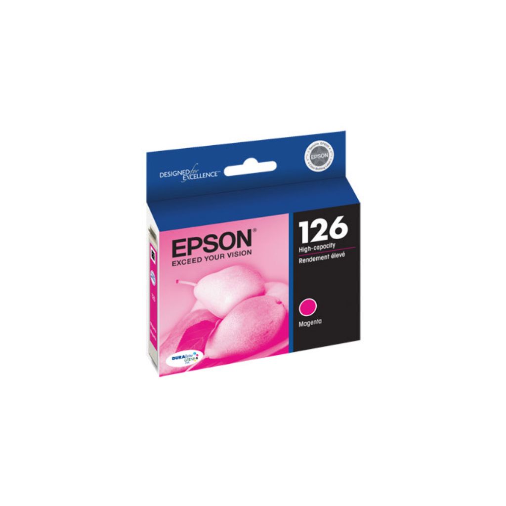 The Epson 126 DURABrite Ultra Magenta High Capacity Ink Cartridge is a genuine Epson ink supply designed for compatible Epson printers. This high-capacity variant offers a significantly higher page yield compared to standard-capacity cartridges, providing more prints per purchase. It utilizes Epson's proprietary DURABrite Ultra pigment-based ink technology, which produces prints that are highly resistant to smudging, fading, and water damage. The resulting prints deliver vibrant color and sharp text quality on a variety of media, including plain paper and glossy photo paper. This magenta cartridge is an essential component for producing full-color documents and photographs. It is engineered to work seamlessly within the Epson printing system to ensure optimal performance, printhead health, and consistent output quality.