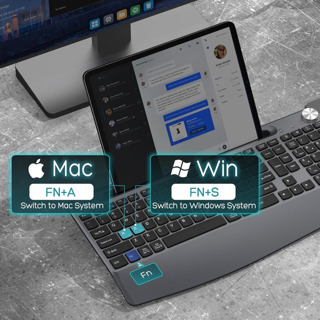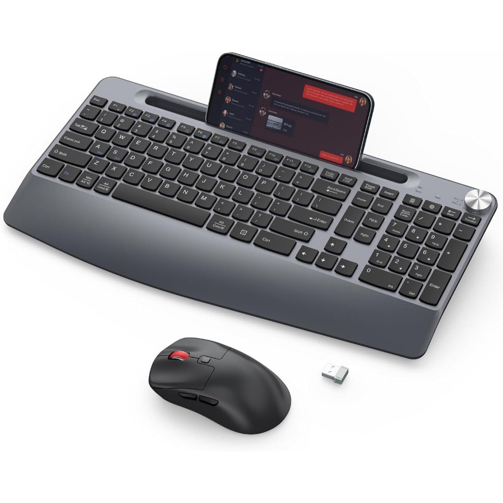 Ergonomic Wireless Keyboard and Mouse with Wrist Rest, Phone Holder, Full-Sized, Low-Profile, Quiet - Gray