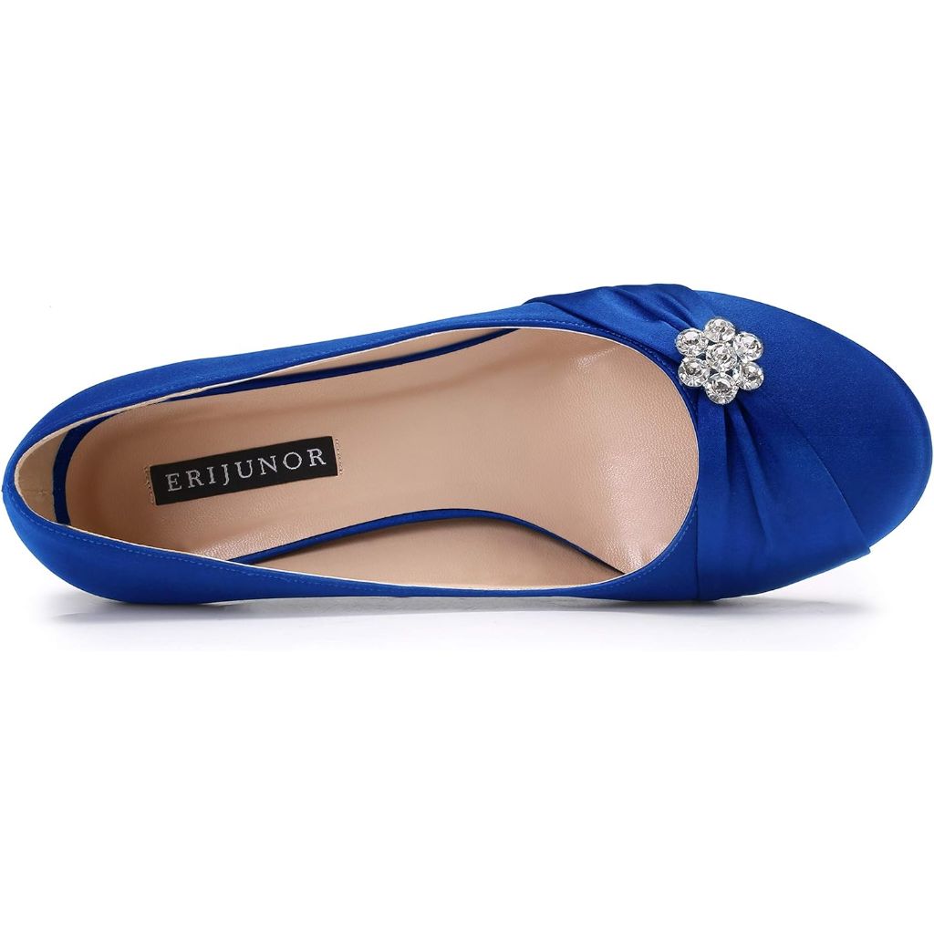 The ERIJUNOR Women's Closed Toe Comfort Kitten Heels are elegant satin pumps designed for formal occasions. Featuring a 1.5-inch kitten heel, these shoes prioritize comfort with integrated gel padding and a cushioned back. The closed-toe design is crafted from pleated satin fabric and is adorned with a decorative rhinestone brooch for added sophistication. Available in a satin blue colorway, these heels are suitable for weddings, proms, evening parties, cocktail events, homecoming, graduation ceremonies, and other special formal occasions. The shoes are designed to fit standard foot sizes.