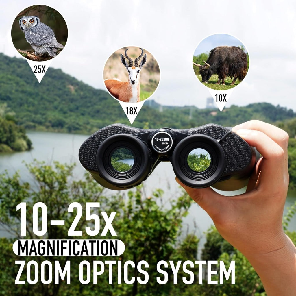 - 10-25x High Powered Zoom Magnification Optics System; Magnification of the binoculars can be adjusted from 10x to 25x through simply twisting the zoom wheel.