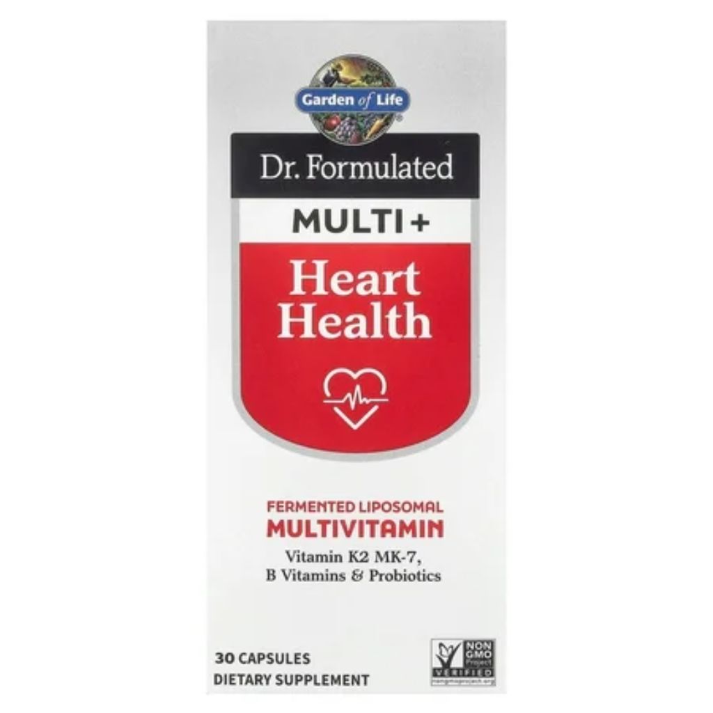 Garden of Life Dr. Formulated Multi+ Heart Health is a fermented, liposomal multivitamin supplement designed to support cardiovascular and circulatory health. Formulated by Dr. David Perlmutter, this dietary supplement features a blend of vitamins and probiotics. It contains 100 mcg of Vitamin K2 MK-7 and a comprehensive profile of B vitamins to promote healthy homocysteine levels and support blood vessel function. The formula utilizes patented liposomal technology to enhance nutrient absorption and is fermented with whole foods. It includes 1 Billion CFU of the clinically studied probiotic Bacillus coagulans SNZ 1969 to support digestive and immune health. The product is Non-GMO Project Verified, NSF Certified, Gluten-Free Certified, vegetarian-friendly, and produced by a Certified B Corporation. It is packaged in a bottle containing 30 capsules.