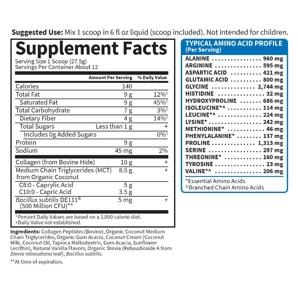Garden of Life Grass Fed Collagen Creamer Powder in Creamy Vanilla flavor is a dietary supplement designed to support beauty and wellness from within. Each serving provides 10 grams of hydrolyzed collagen peptides sourced from grass-fed, pasture-raised bovine collagen, which includes Type I and III collagen. The formula is enhanced with 8.5 grams of coconut-derived Medium-Chain Triglycerides (MCTs) from organic coconuts and coconut milk. It also contains 500 million CFU of probiotics to support digestive health and nutrient absorption. This powder is formulated to dissolve quickly and easily in hot or cold beverages like coffee or tea, and can also be used in baking recipes. It is designed to help support healthy hair, skin, nails, and joints. The product is certified Non-GMO Project Verified, NSF Gluten-Free, and is produced in cGMP (Current Good Manufacturing Practice) facilities. It contains no dairy, added hormones, or antibiotics. Each container provides approximately 12 servings. *These statements have not been evaluated by the Food and Drug Administration. This product is not intended to diagnose, treat, cure, or prevent any disease.