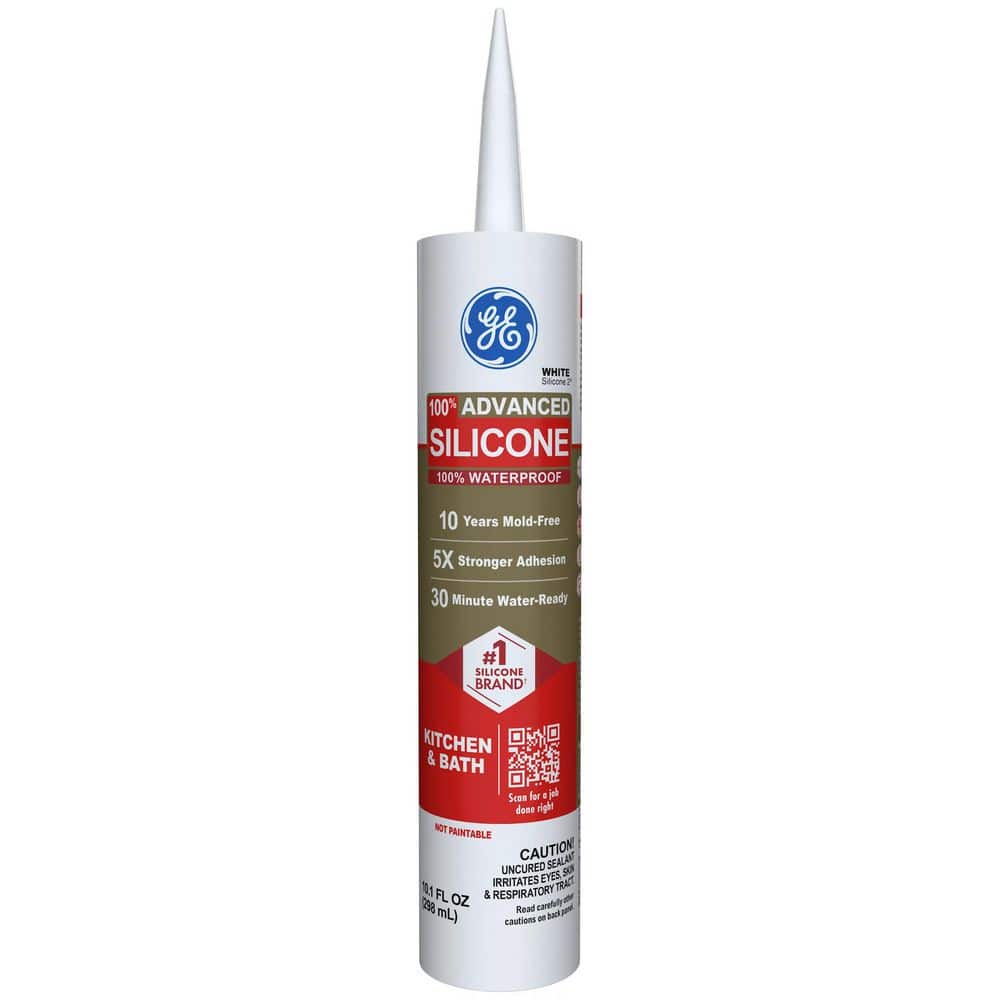 GE Advanced Silicone 2 Kitchen and Bath Sealant is a high-performance, 100% silicone and 100% waterproof sealant specifically formulated for areas with high moisture exposure, such as kitchens, bathrooms, and showers. It features a permanently flexible formula that offers 40% more flexibility than Class 25 sealants and provides 5X stronger adhesion than GE's Silicone 1 sealant. The neutral-cure formula results in low odor during curing. The sealant is ready for water exposure in 30 minutes and offers 10-year mold-free product protection, inhibiting the growth of mold and mildew. It is designed to not discolor most high-end metal finishes, including chrome, bronze, and nickel. This white sealant is suitable for use on a wide variety of surfaces including most metals, plastics, woods, glass, drywall, plaster, granite, and more. It comes in a 10.1 fluid ounce cartridge for easy application with a standard caulking gun.