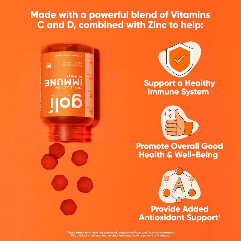 Goli Triple Action Immune Gummies are a dietary supplement designed to support immune system function. Each bottle contains 60 gummies formulated with a combination of key nutrients including Vitamin C, Vitamin D, and Zinc, which are known to help maintain immune function. The formula is enhanced with Elderberry extract, traditionally used to support overall wellness. Additional ingredients include Echinacea extract, turmeric powder, and ginger extract. The gummies are vegan, non-GMO, gluten-free, and gelatin-free, making them suitable for various dietary preferences. They are manufactured in the USA in allergen-free, cGMP certified facilities using both local and globally sourced ingredients. Goli is a brand that supports Vitamin Angels through its operations.
