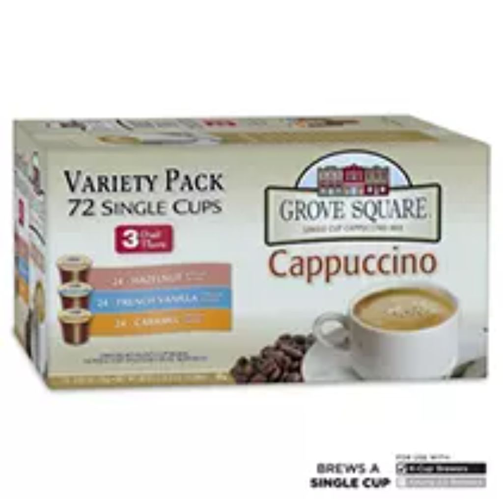 The Grove Square Cappuccino Flavor Variety Pack contains 24 single-serve cups, offering a convenient way to sample three popular cappuccino flavors. This assortment includes Vanilla, Caramel, and Hazelnut cappuccino mixes. Each cup contains a pre-measured mix of coffee, creamer, and sweetener, designed to deliver a consistent, sweetened cappuccino experience. The product is formulated to provide a stimulating aroma and a rich, creamy taste. It is intended for preparation by simply adding hot water to the contents of a single cup, making it a quick and easy coffee treat suitable for any time of day. The variety pack format allows users to enjoy different flavor profiles without committing to a large quantity of a single type.