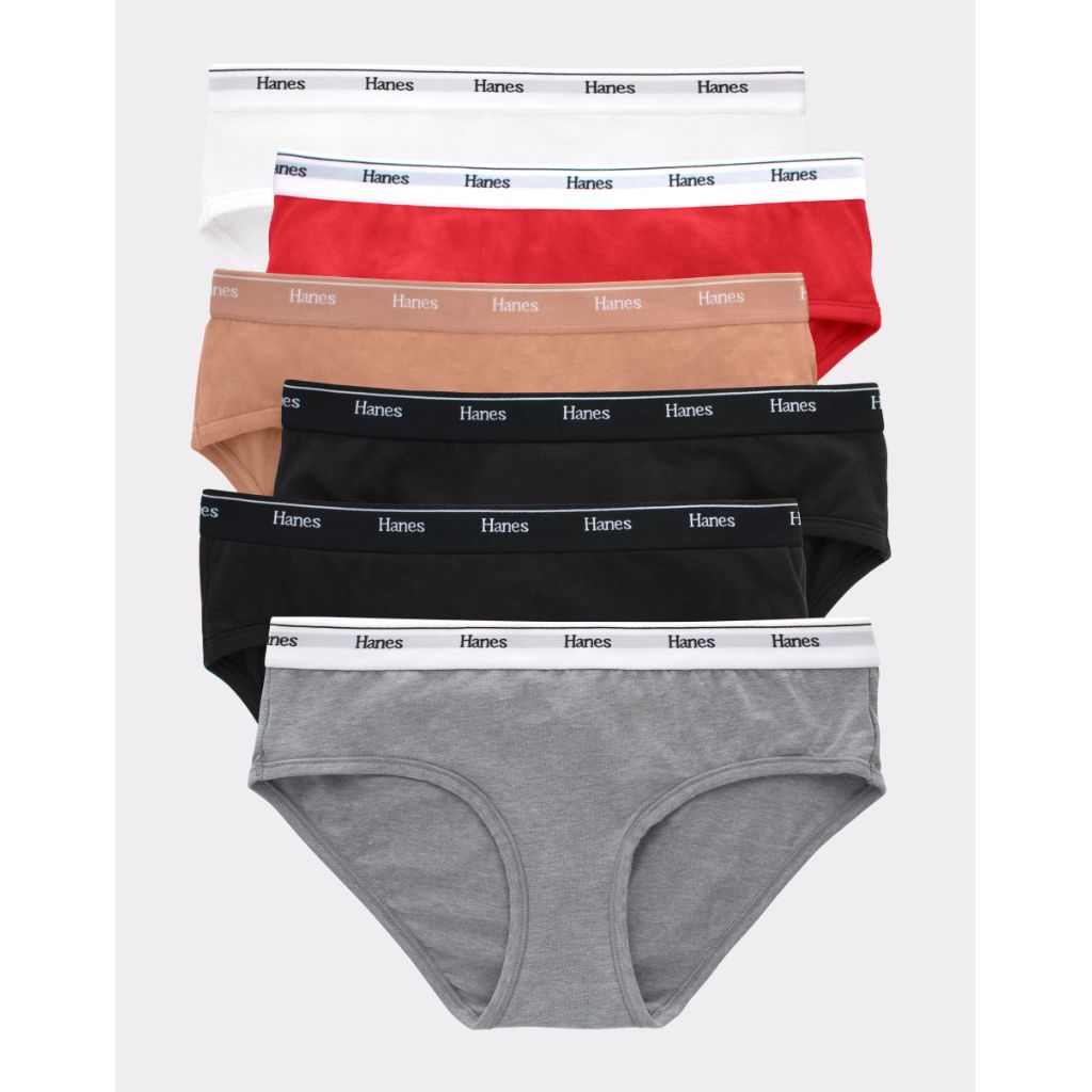 The Hanes Originals Hipster Panties are a 6-pack of women's underwear designed for everyday comfort and style. Made from a soft, breathable cotton-rich blend with a hint of spandex for stretch and flexibility, these panties offer a lightweight feel and moisture-wicking properties to help keep you cool. The modern hipster cut provides moderate coverage front and back, hugging your curves for a flattering fit. The Tagless construction eliminates itchy tags for added comfort, while the design helps resist ride-up for a secure, worry-free fit throughout the day. Available in a variety of bright colors and expressive prints, each pair features the iconic Hanes branding. This pack contains six panties in size Medium.