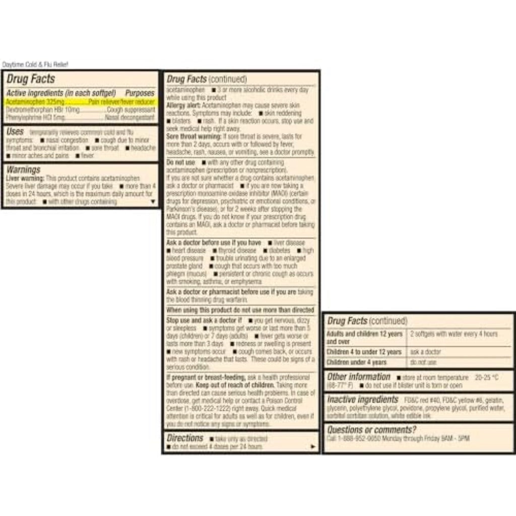 HealthA2Z Daytime Cold & Flu Medicine is a multi-symptom relief formula designed for daytime use. This medication combines several active ingredients to address common cold and flu symptoms, including headache, sore throat, nasal congestion, minor body aches, and fever. The daytime formula is intended to provide symptom relief without causing drowsiness, allowing users to remain active and comfortable. The product is packaged in a convenient bottle containing 20 softgels for easy dosing and portability. It is formulated with a pain reliever and fever reducer, a cough suppressant, and a nasal decongestant to offer comprehensive support during illness. The softgel format is designed for easy swallowing.