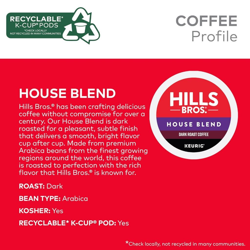Hills Bros House Blend Keurig K-Cup Coffee Pods are a medium roast coffee blend designed for use with Keurig single-serve brewing systems. This 72-count package contains coffee pods with a balanced flavor profile featuring notes of nuts and chocolate. The House Blend is crafted from 100% Arabica beans and is certified Orthodox Union Kosher. Each K-Cup pod is individually sealed to preserve freshness and ensure consistent flavor with every brew. The product is compatible with all Keurig K-Cup brewers, providing a convenient single-serve coffee solution for home or office use. FEATURES
