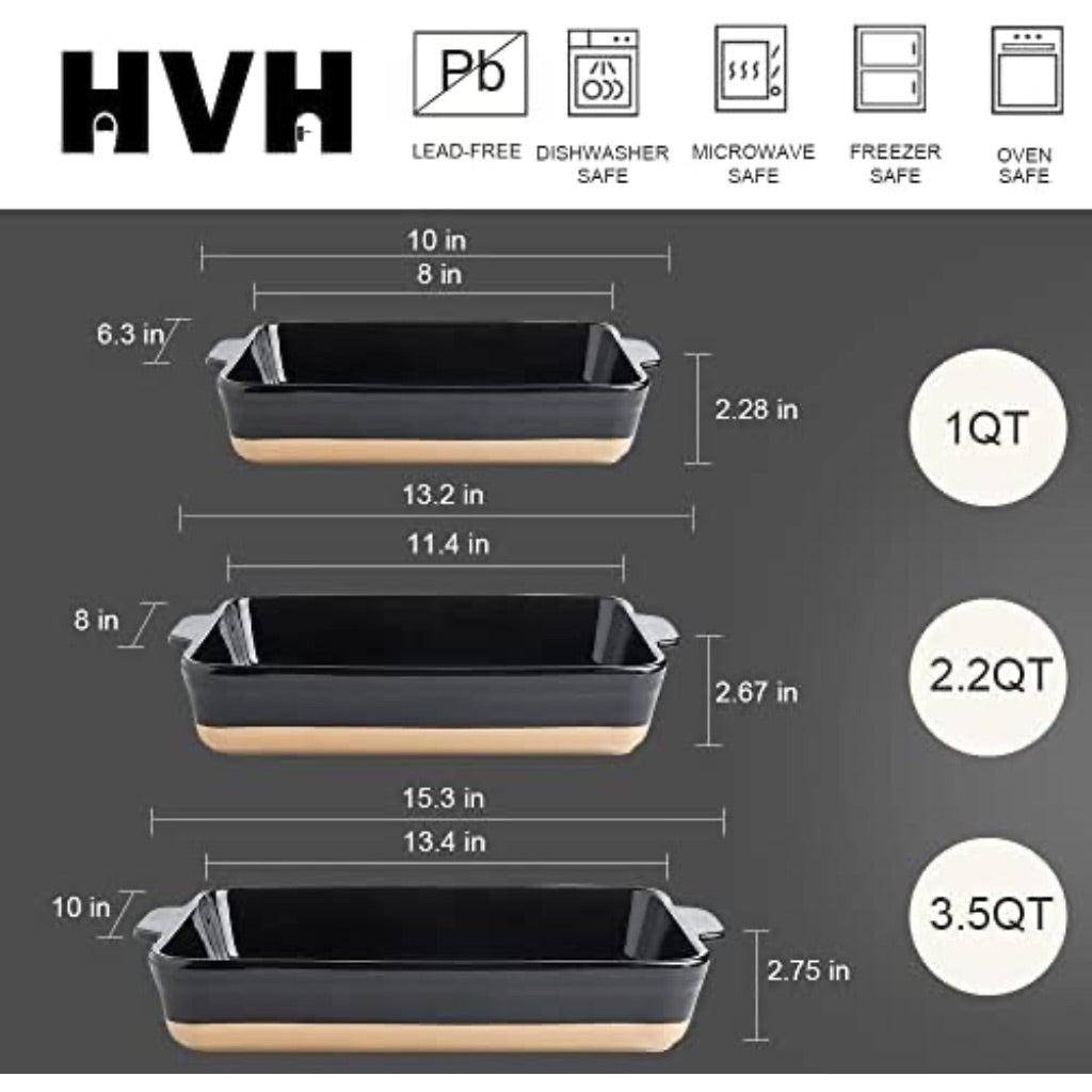 The HVH Baking Dish Set is a collection of three ceramic casserole dishes designed in a farmhouse style. The set includes three sizes: a large 13.5"L x 9.3"W x 2.8"H (3.7 qt) pan, a medium 11"L x 7.7"W x 2.6"H (2.1 qt) pan, and a small 8"L x 6"W x 2.5"H (1 qt) pan. Constructed from high-quality, lead-free ceramic, the dishes feature a smooth glazed interior that resists sticking, staining, and odor absorption. The bakeware is oven-safe up to 500°F and is also safe for use in microwaves, refrigerators, and dishwashers. The thick ceramic construction provides heat retention to keep food warm. The set is suitable for preparing, baking, and serving a variety of dishes including casseroles, lasagna, pasta, meats, and vegetables.